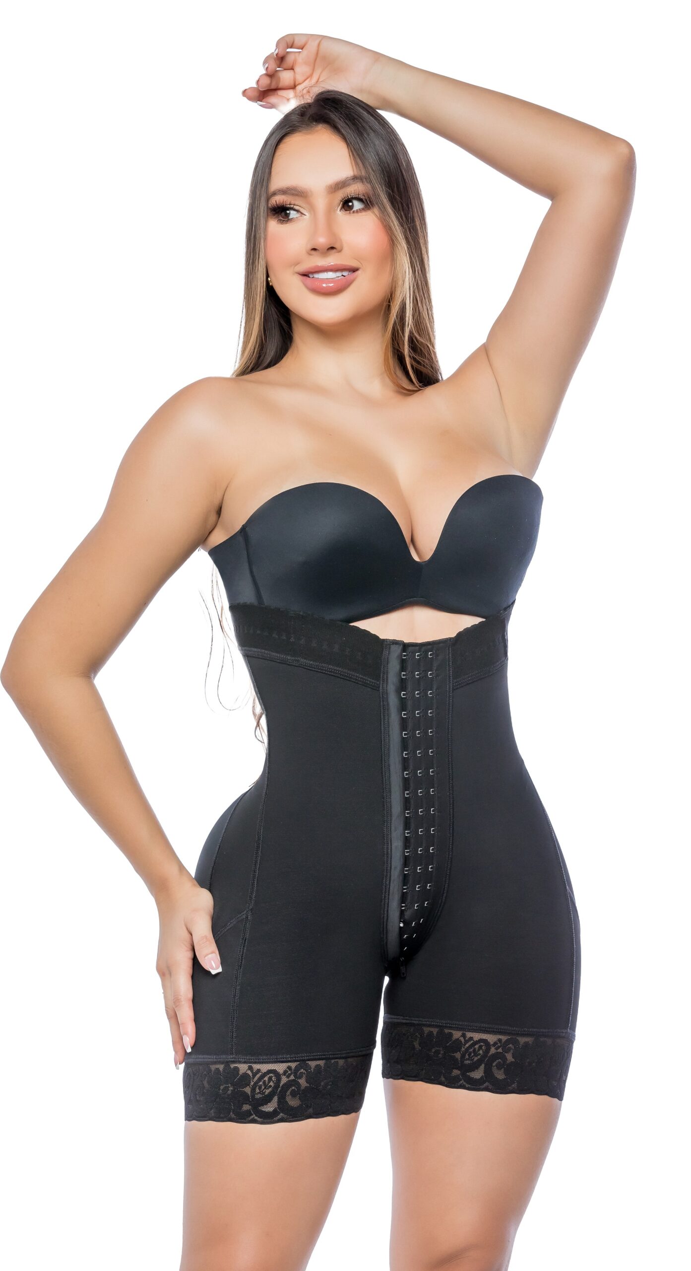Diseñado para esculpir la figura con compresión firme y estilizar la silueta. Presenta silueta semi reloj de arena, cola con máximo realce y 3 niveles de broches para un ajuste preciso. Incorpora encaje siliconado en pierna que evita deslizamientos y mantiene la prenda en su lugar.